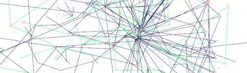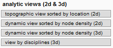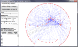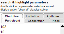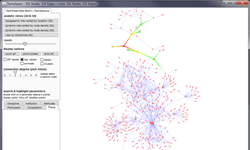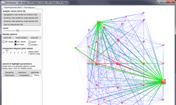 Das wichtigste Analysetool für das WeltWissenNetz ist die umfangreiche Suchfunktion. Wählt ein Teilnehmer unter Participant seine Teilnehmernummer, die ihm persönlichen Bereich angezeigt wird, so wird sein Knoten durch einen blauen Rahmen hervorgehoben. Mit zoom picked kann er den Bereich vergrößern. Entsprechend kann man die verschiedenen Disziplinen, Einrichtungen, Kooperationen oder Standorte recherchieren. Die avanciertesten Funktionen befinden sich unter Attributes. In der rechten Spalte können die Attribute aller Knoten angezeigt werden, in der linken können die Art der Verbindung hervorgehoben. Je nachdem, ob sich die Wissenschaftler über die Forschung, die Lehre, die Verwaltung kennen oder ob der Kontakt eher informeller Natur ist, werden die Kanten der der Intensität entsprechend in drei Farben oder transparent dargestellt (s.u.)