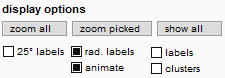 Hier können Sie die Anzeige verändern. Zoom all zeigt das gesamte Netzwerk. Wenn Sie einen Knoten markiert haben, dann können Sie den Bereich mit zoom picked näher heranholen. Sie können die Beschriftungen unterschiedlich darstellen oder ausblenden. Das Deaktivieren von animate friert die Visualisierung ein. Mit clusters können Sie eine bestimmte Clusterform darstellen.